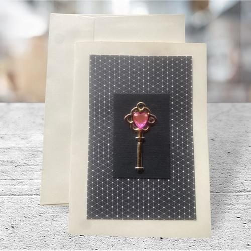 The Pink Jewel Key card features a charming vintage-style key with a pink heart on a geometric patterned background. when you open the card, you find the heart the key is for. Ideal for conveying heartfelt messages on any occasion, it includes a matching envelope for a elegant presentation.