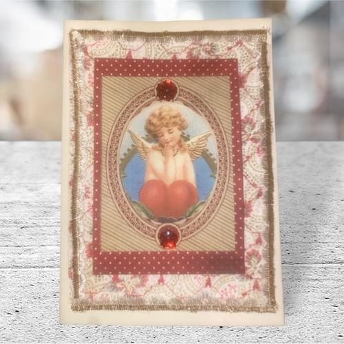 Cream cardstock with paper, lace, and adornments.